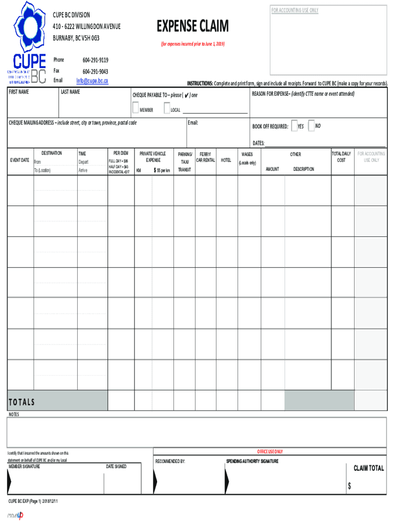 CUP BC DIVISION 410 6222 WILLING DON AVENUE BURNABY, BC V5H 0G3 Phone6042919119Fax Email6042919043FIRST NAME ACCOUNTING USE ONLYEXPENSE CLAIM (for expenses incurred prior to June 1, 2019)info cup.bc.instructions: