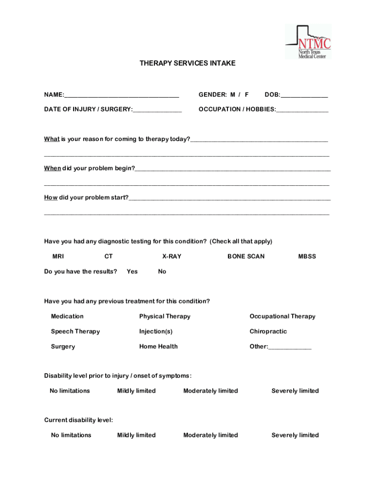 THERAPY SERVICES INTAKENAME: GENDER: M / DOB: DATE OF INJURY / SURGERY: OCCUPATION / HOBBIES: What is your reason for coming to therapy today? When did your problem begin? How did your problem start?