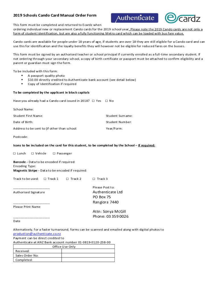2019 Schools Candy Card Manual Order Form