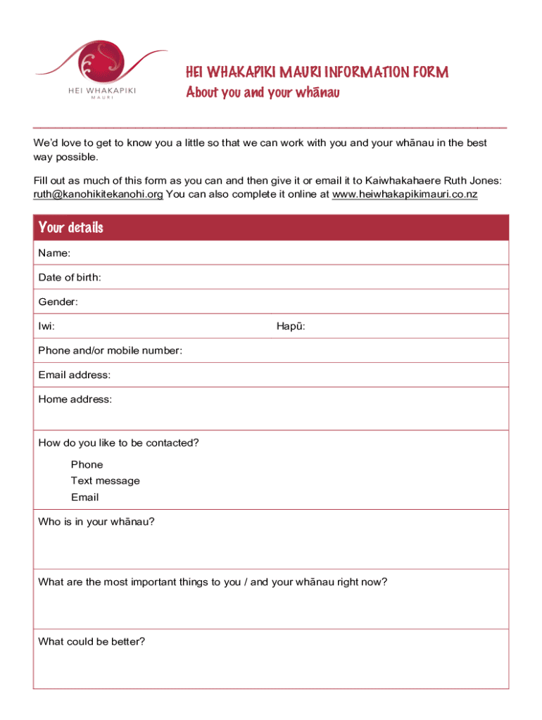 HE WHAKAPIKI MAORI INFORMATION FORM About you and your what We'd love to get to know you a little so that we can work with you and your what in the best way possible. Fill out as much of this form