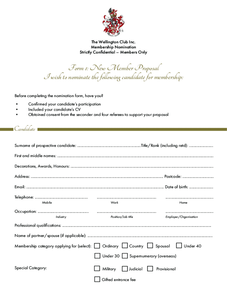 Candidate Membership Information Wellington Club Candidate for New Membership Information Sheet