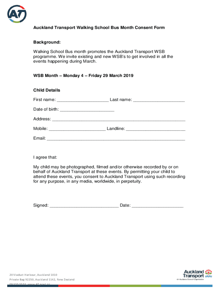 Auckland Transport Walking School Bus Month Consent FormBackground: Walking School Bus month promotes the Auckland Transport WSB program. We invite existing and new SBS to get involved in all the