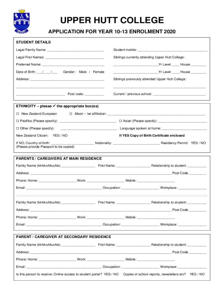 UPPER HUNT COLLEGE APPLICATION FOR YEAR 1013 Enrollment 2020 STUDENT DETAILS Legal Family Name: Student mobile: Legal First Names: Siblings currently attending Upper Hunt College:Preferred Name: Yr