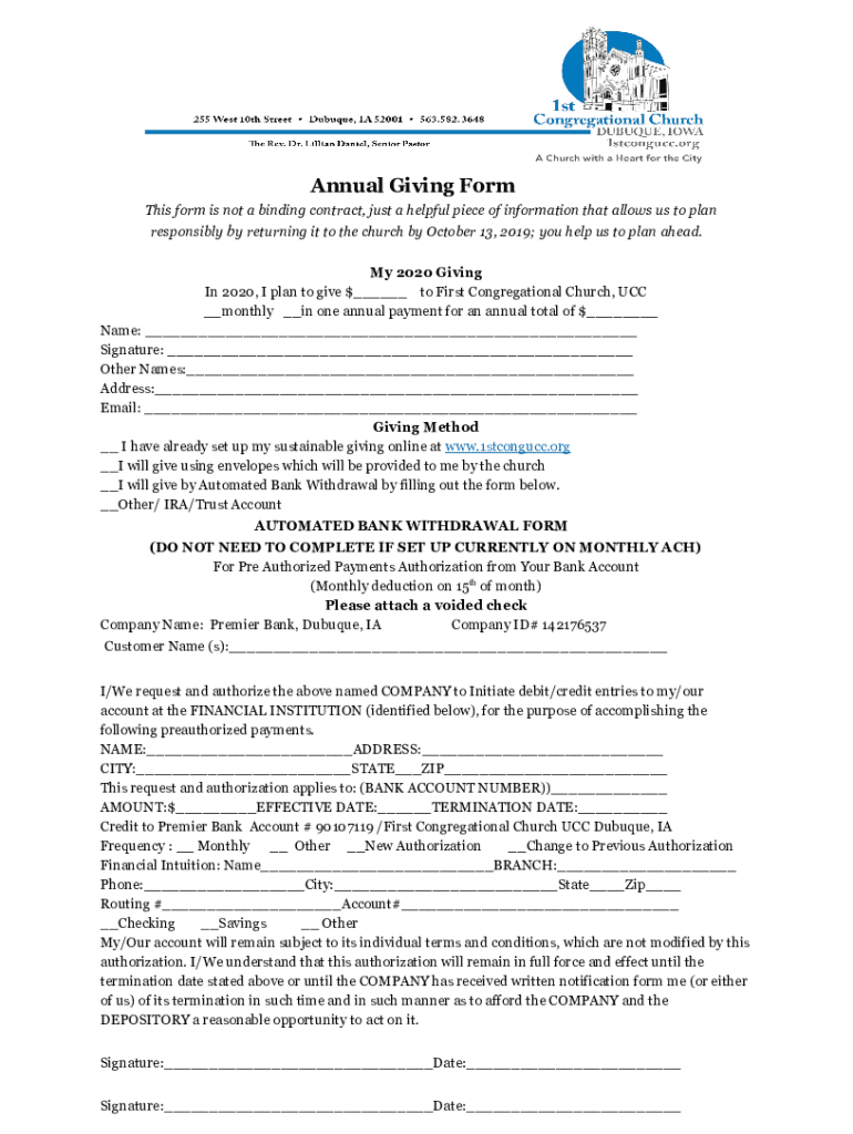 Annual Giving Form This form is not a binding contract, just a helpful piece of information that allows us to plan responsibly by returning it to the church by October 13, 2019; you help us to plan