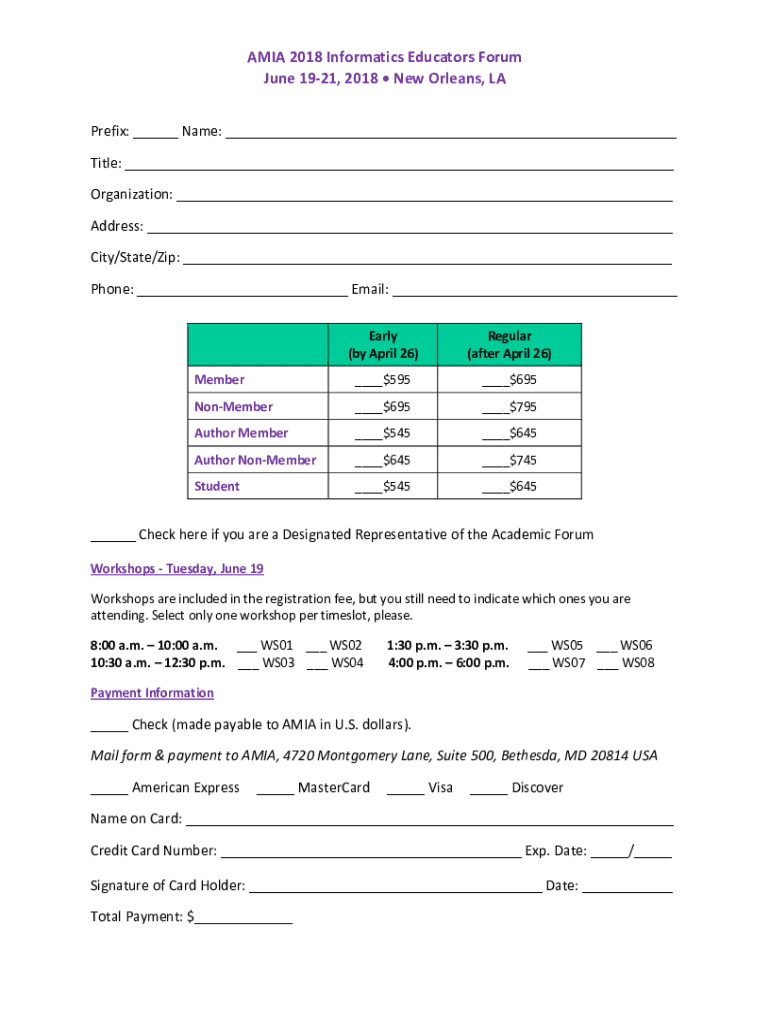 ASIA 2018 Informatics Educators Forum June 1921, 2018 New Orleans, LA Prefix: Name: Title: Organization: Address: City/State/Zip: Phone: Email: Early (by April 26)Regular (after April 26)Member $$595695NonMember