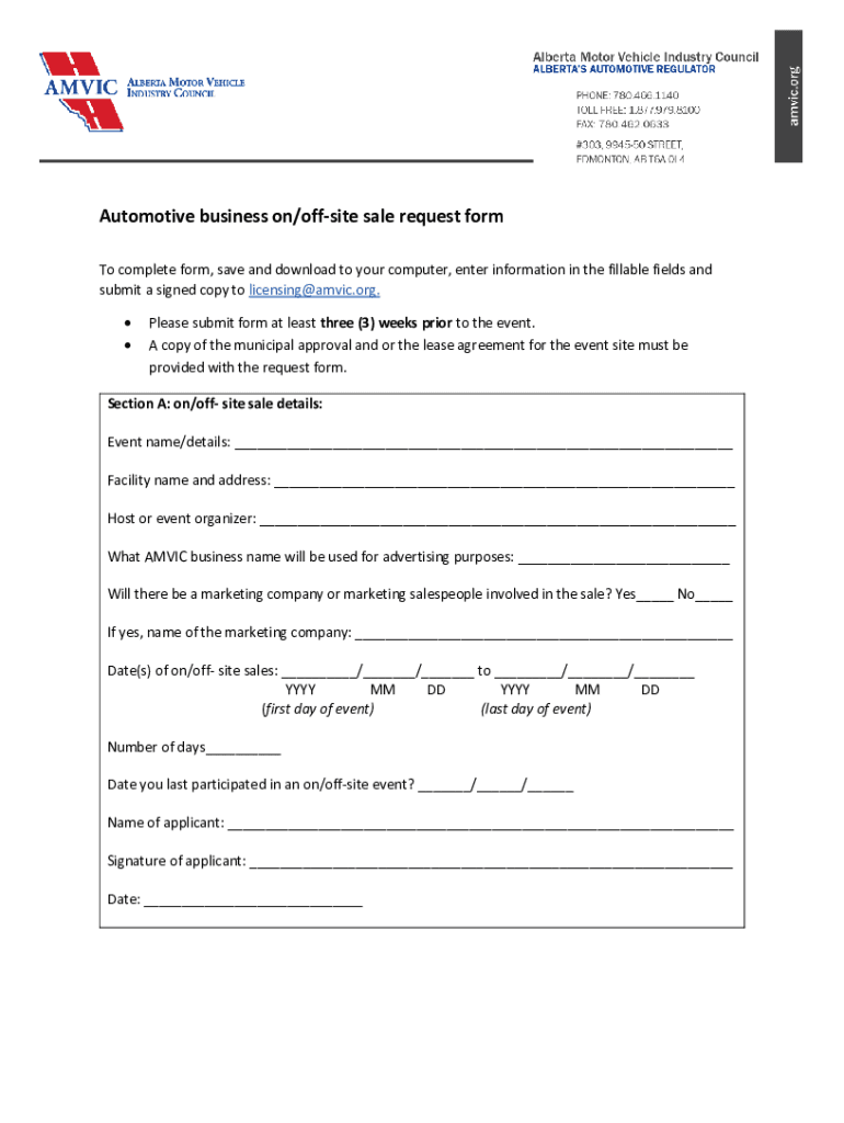 Automotive business on/offsite sale request form To complete form, save and download to your computer, enter information in the fillable fields and submit a signed copy to licensing advice.org. Please