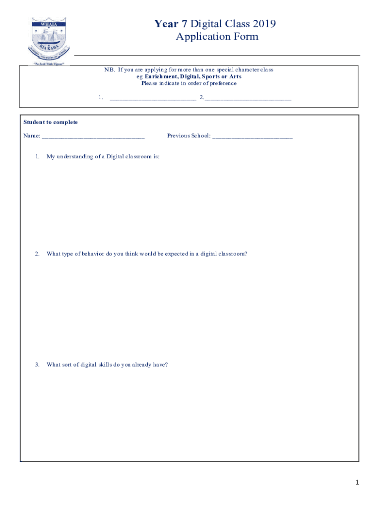 Year 7 Digital Class 2019 Application Form NB. If you are applying for more than one special character class e.g. Enrichment, Digital, Sports or Arts Please indicate in order of preference 1. 2. Student
