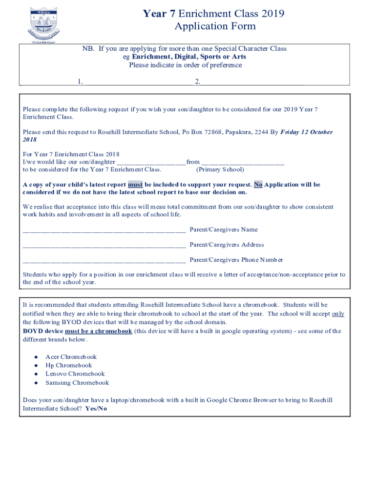 Year 7 Enrichment Class 2019 Application Form NB. If you are applying for more than one Special Character Class e.g. Enrichment, Digital, Sports or Arts Please indicate in order of preference 1. 2.