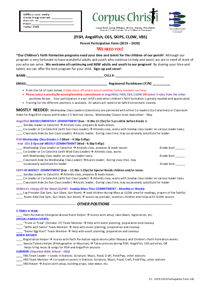 (FISH, Angelfish, CGS, SKIPS, LOW, VBS) Parent Participation Form (2019 2020)WE NEED YOU!*Our Children's Faith Formation programs need your time and talent for the children of our parish! Although