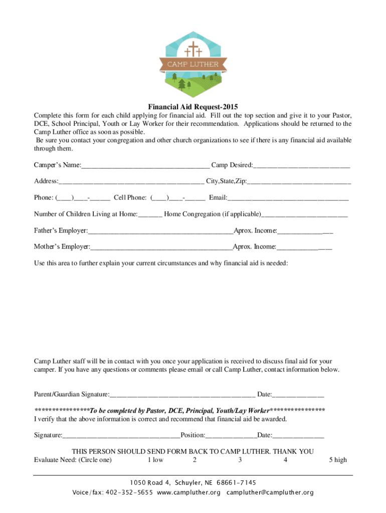Financial Aid Request2015 Complete this form for each child applying for financial aid. Fill out the top section and give it to your Pastor, DCE, School Principal, Youth or Lay Worker for their recommendation.
