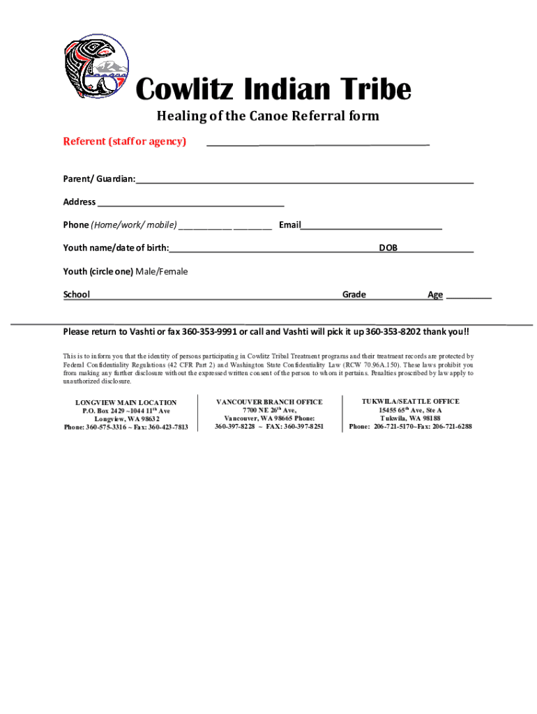 Cowling Indian Tribe Healing of the Canoe Referral formReferent (staff or agency) Parent/ Guardian: Address Phone (Home/work/ mobile) Email Youth name/date of birth:Youth (circle one) Male/Female