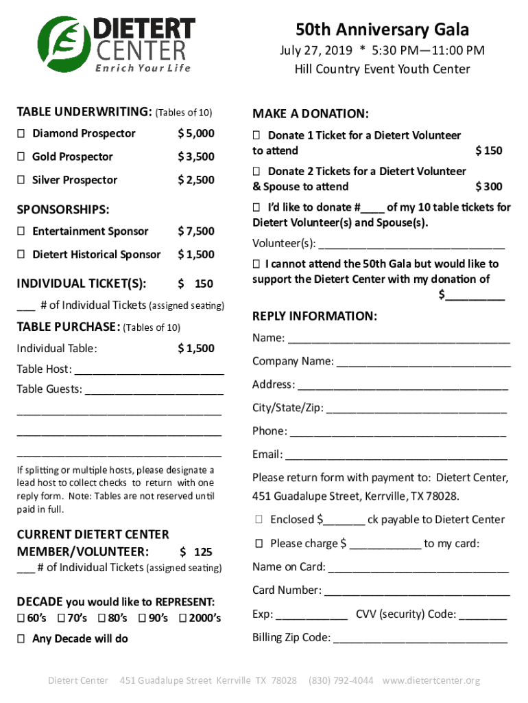 50th Anniversary Gala July 27, 2019 × 5:30 PM11:00 PM Hill Country Event Youth Center TABLE UNDERWRITING: (Tables of 10)MAKE A DONATION: Diamond Prospector 5,000 Gold Prospector 3,500 Donate 1 Ticket