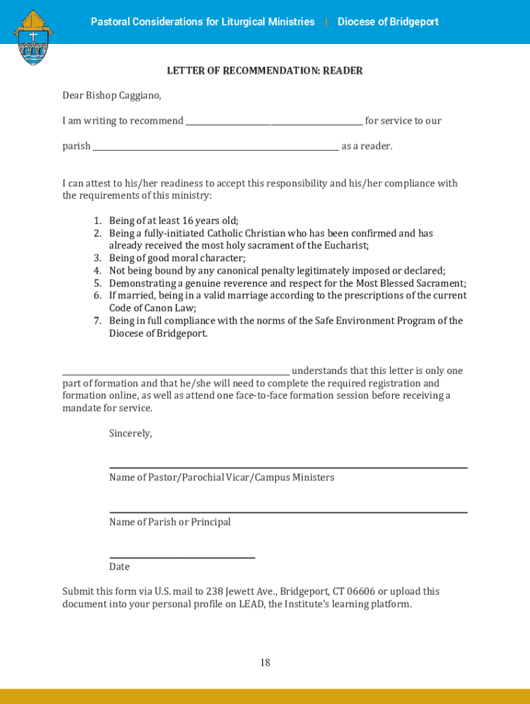 Pastoral Considerations for Liturgical Ministries Diocese of BridgeportLETTER OF RECOMMENDATION: READER Dear Bishop Cassiano, I am writing to recommend for service to our parish as a reader. I can