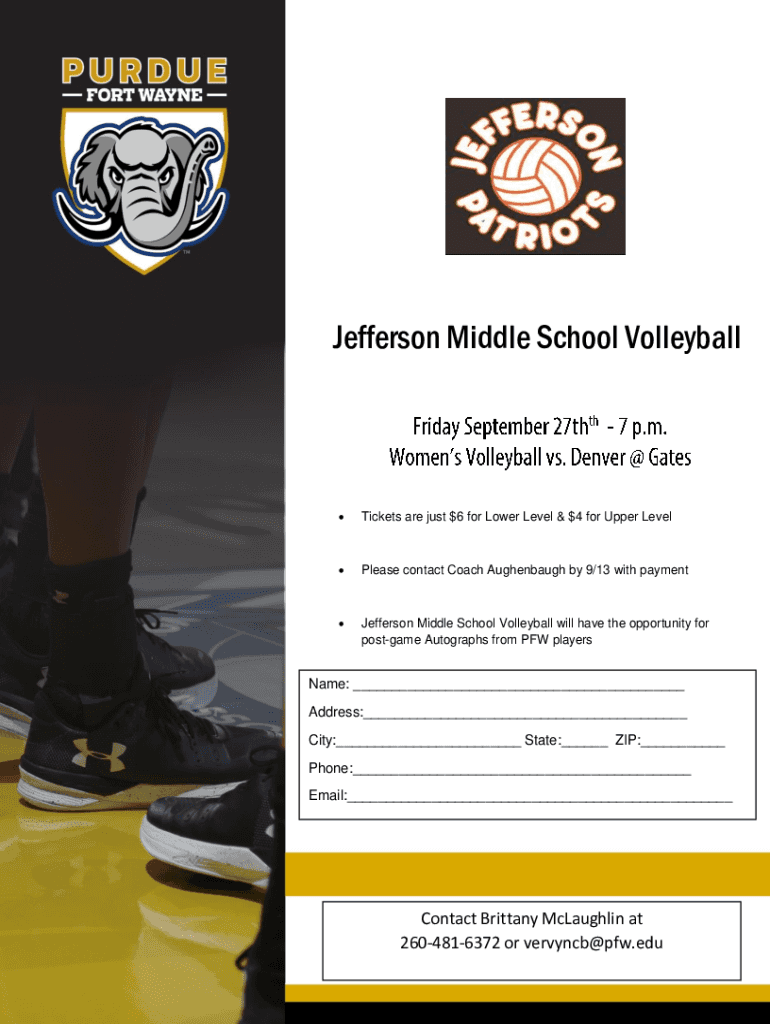 Jefferson Middle School VolleyballTickets are just $6 for Lower Level & $4 for Upper LevelPlease contact Coach Aughenbaugh by 9/13 with payment Jefferson Middle School Volleyball will have the opportunity