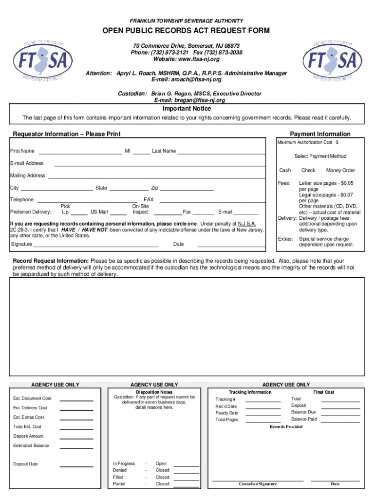 Get the free FRANKLIN TOWNSHIP SEWERAGE AUTHORITY OPEN PUBLIC RECORDS ...