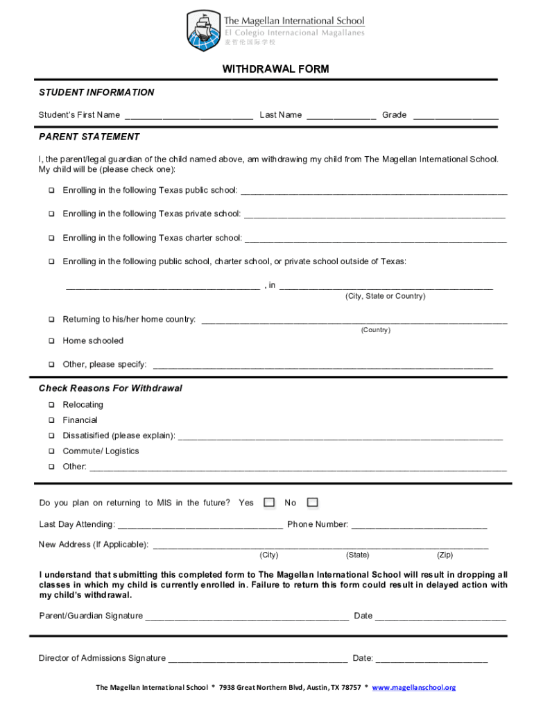 WITHDRAWAL FORM STUDENT INFORMATION Students First Name Last Name Grade PARENT STATEMENT I, the parent/legal guardian of the child named above, am I withdrawing my child from The Magellan International
