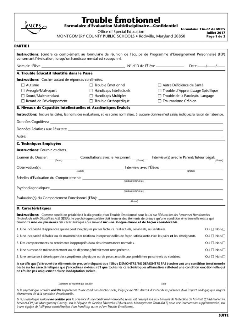 Trouble motionnelFormulaire evaluation MultidisciplinaireConfidentiel Formula ire 33667 de MCPS Office of Special Education Bullet 2017 MONTGOMERY COUNTY PUBLIC SCHOOLS Rockville, Maryland 20850-Page