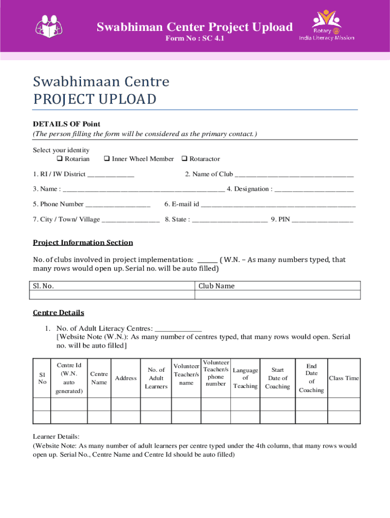 Swabian Center Project Upload Form No : SC 4.1Swabhimaan Center PROJECT UPLOAD DETAILS OF Point (The person filling the form will be considered as the primary contact.) Select your identity Rotarian