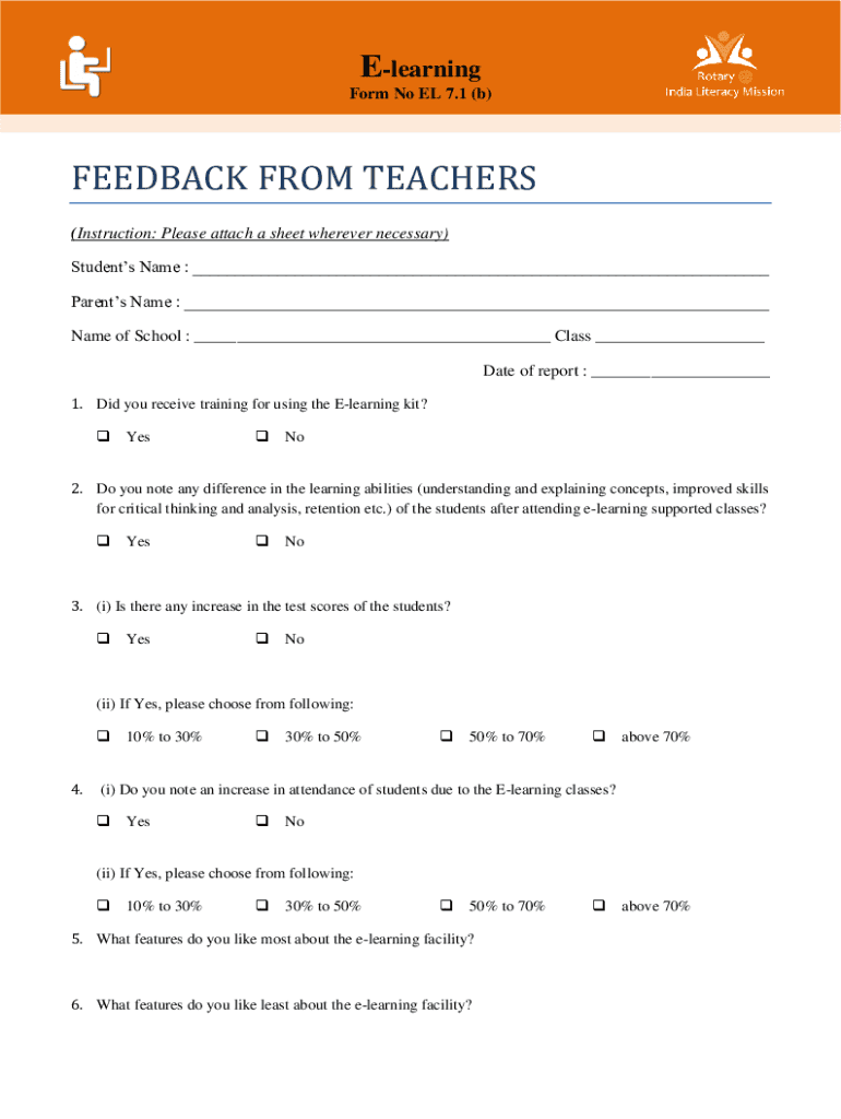 E-learning Form No EL 7.1 (b)FEEDBACK FROM TEACHERS (Instruction: Please attach a sheet wherever necessary) Students Name : Parents Name : Name of School : Class Date of report : 1. Did you receive