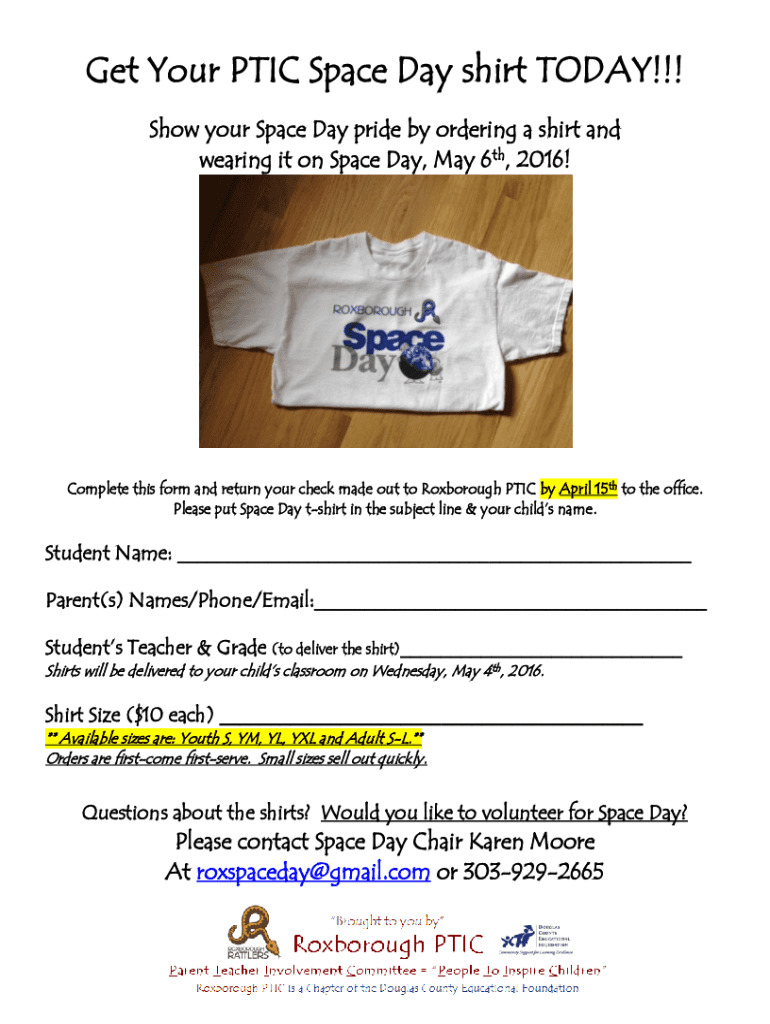 Get Your OPTIC Space Day shirt TODAY!!! Show your Space Day pride by ordering a shirt and wearing it on Space Day, May 6th, 2016! Complete this form and return your check made out to Foxborough OPTIC