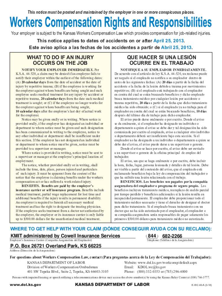 Employers who are required to have workers' compensation insurance under Kansas law must file the k-wc 40 - 'posting'.