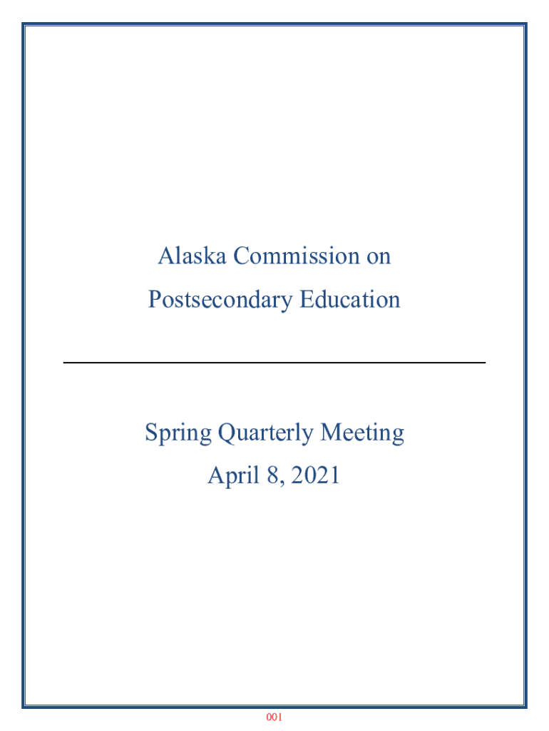 Alaska Commission on Postsecondary EducationSpring Quarterly Meeting April 8, 2021001ALASKA COMMISSION ON POSTSECONDARY EDUCATION Teleconference: 1 (800) 3156338; Code: 67401# AGENDA Thursday, April