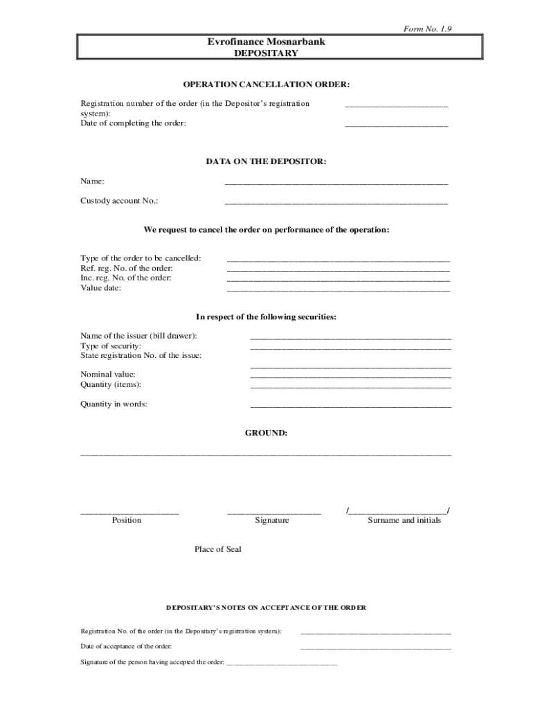 Form No. 1.9Evrofinance Mountebank DEPOSITARYOPERATION CANCELLATION ORDER: Registration number of the order (in the Depositors' registration system): Date of completing the order: DATA ON THE DEPOSITOR: