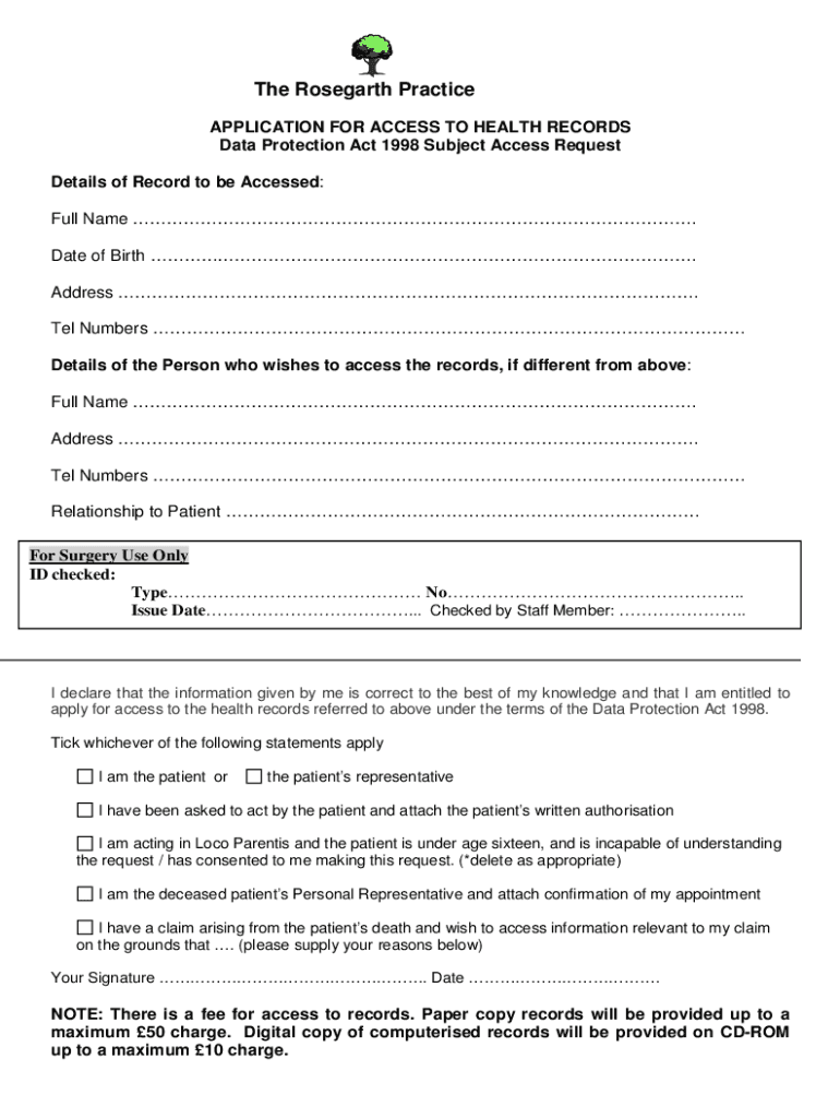 The Research Practice APPLICATION FOR ACCESS TO HEALTH RECORDS Data Protection Act 1998 Subject Access Request Details of Record to be Accessed: Full Name. Date of Birth. Address. Tel Numbers.