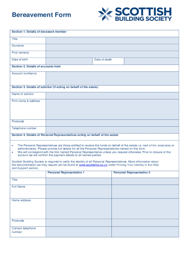 Bereavement Form Section 1. Details of deceased member Title Surname First name(s) Date of birthDate of detection 2. Details of accounts held Account number(s)Section 3. Details of solicitor (if acting