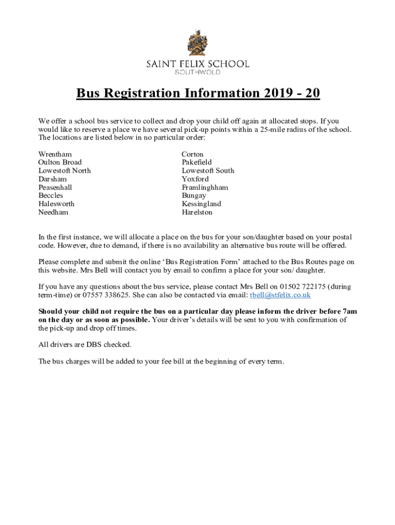 Bus Registration Information 2019 20 We offer a school bus service to collect and drop your child off again at allocated stops. If you would like to reserve a place we have several pickup points within