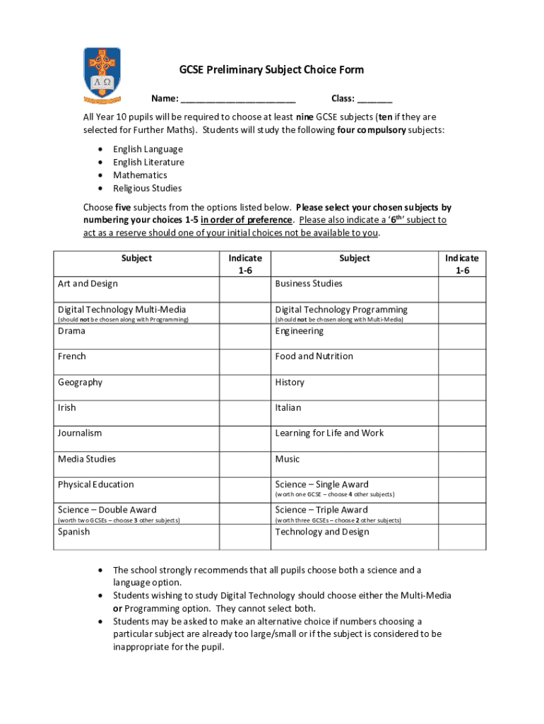 The preliminary subject choice form generally requires students to report their name, grade level, selected subjects, and any other relevant personal information.