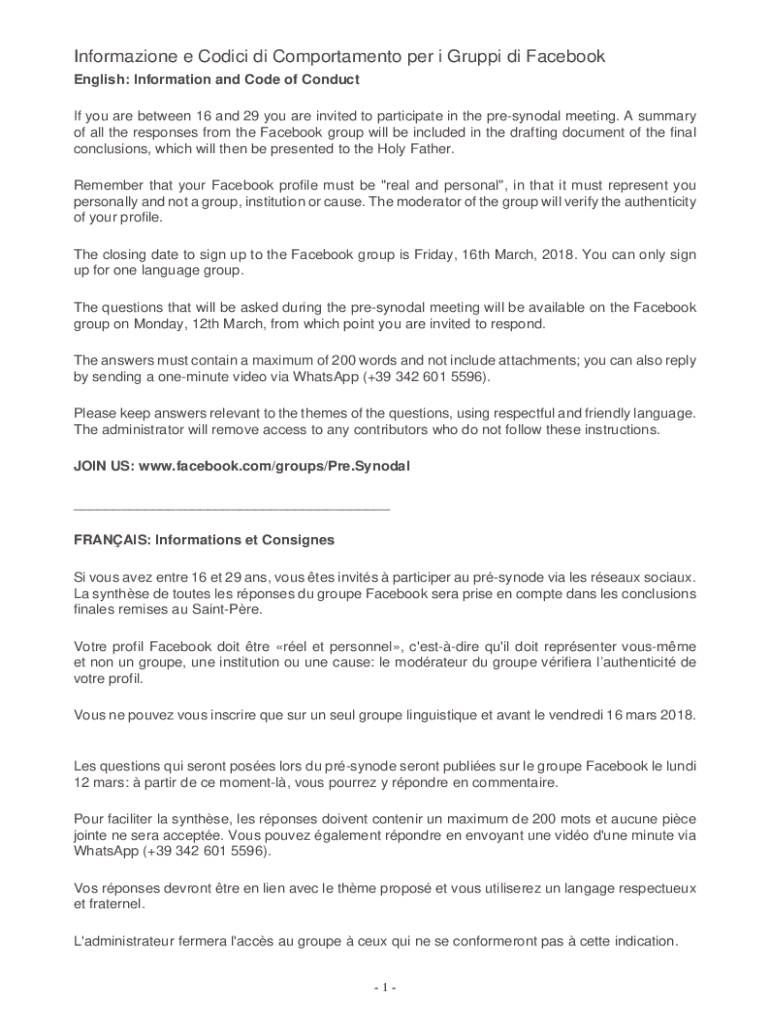 Information e Codicil DI Comportment per i Krupp di Facebook English: Information and Code of Conduct If you are between 16 and 29 you are invited to participate in the presynodal meeting. A summary