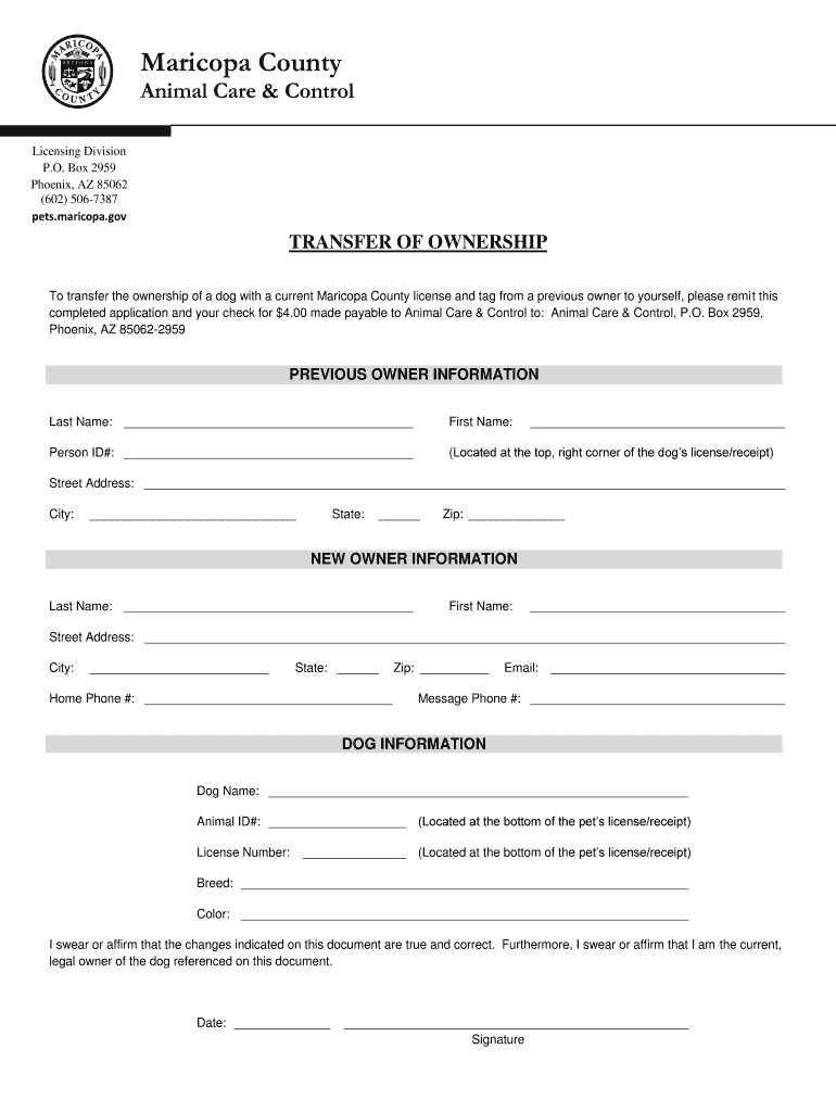 Any current dog owner in Maricopa County wishing to transfer ownership of their licensed dog to a new owner can utilize this form. Both the previous owner and new owner must provide accurate information.