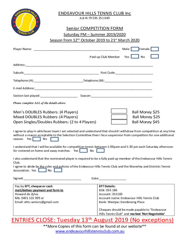 Endeavor HILLS TENNIS CLUB Inc A.B.N 79 035 251 649Senior COMPETITION FORM Saturday PM Summer 2019/2020 Season from 12th October 2019 to 21st March 2020 Player Name: Male Paid up Club MemberYesFemale