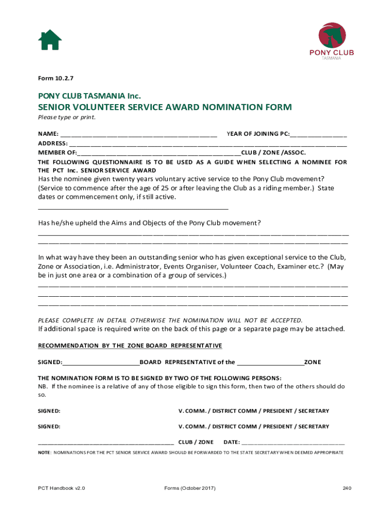 Form 10.2.7PONY CLUB TASMANIA Inc. SENIOR VOLUNTEER SERVICE AWARD NOMINATION Formulas type or print.NAME: YEAR OF JOINING PC: ADDRESS: MEMBER OF: CLUB / ZONE /ASSOC.THEFOLLOWINGQUESTIONNAIREISTOBEUSEDASAGUIDEWHENSELECTINGANOMINEEFORTHEPCTInc.SENIOR