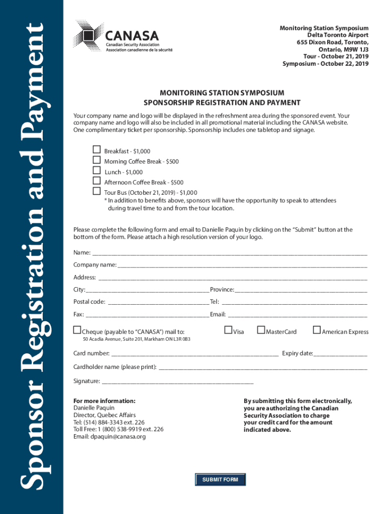 Sponsor Registration and PaymentMonitoring Station Symposium Delta Toronto Airport 655 Dixon Road, Toronto, Ontario, M9W 1J3 Tour October 21, 2019, Symposium October 22, 2019MONITORING STATION SYMPOSIUM