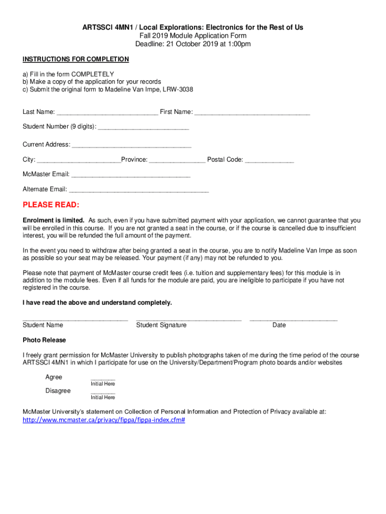 ARTS SCI 4MN1 / Local Explorations: Electronics for the Rest of Us Fall 2019 Module Application Form Deadline: 21 October 2019 at 1:00pm INSTRUCTIONS FOR COMPLETION a) Fill in the form COMPLETELY