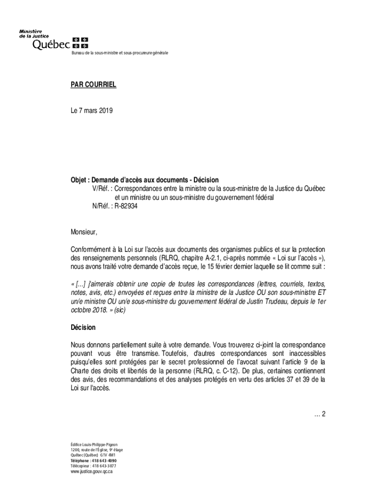 Bureau DE la sousministre et sousprocureure gnralePAR COURIER Le 7 mars 2019Objet : Demand daces aux documents Decision V/Rf. Correspondences entire la minister of la sousministre de la Justice du