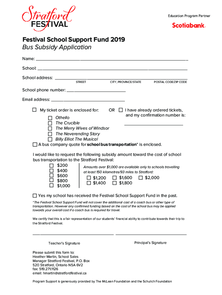 Education Program PartnerFestival School Support Fund 2019 Bus Subsidy Application Name: School: School address: STREETCAR, PROVINCE/STATEPOSTAL CODE/ZIP Homeschool phone number: Email address: My
