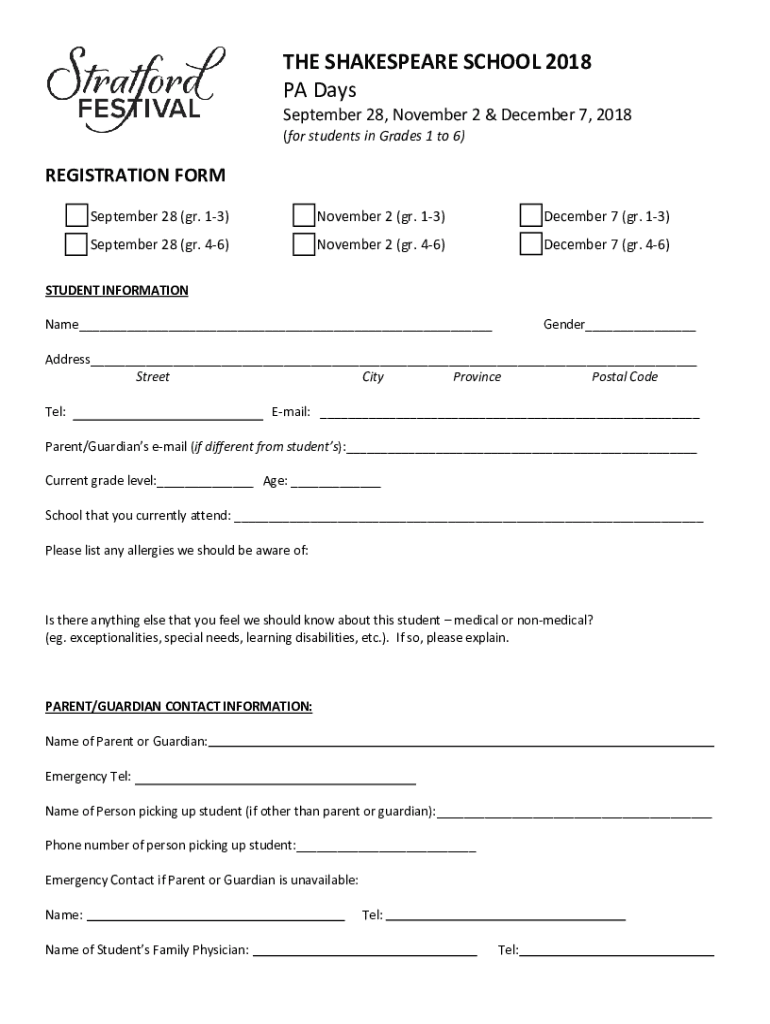 THE SHAKESPEARE SCHOOL 2018 PA Days September 28, November 2 & December 7, 2018 (for students in Grades 1 to 6)REGISTRATION FORM September 28 (gr. 13)November 2 (gr. 13)December 7 (gr. 13)September