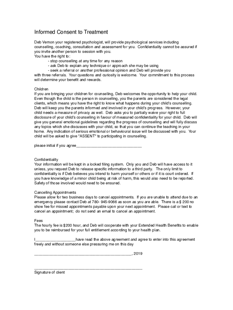 Informed Consent to Treatment Deb Vernon your registered psychologist, will provide psychological services including counselling, coaching, consultation and assessment for you. Confidentiality cannot