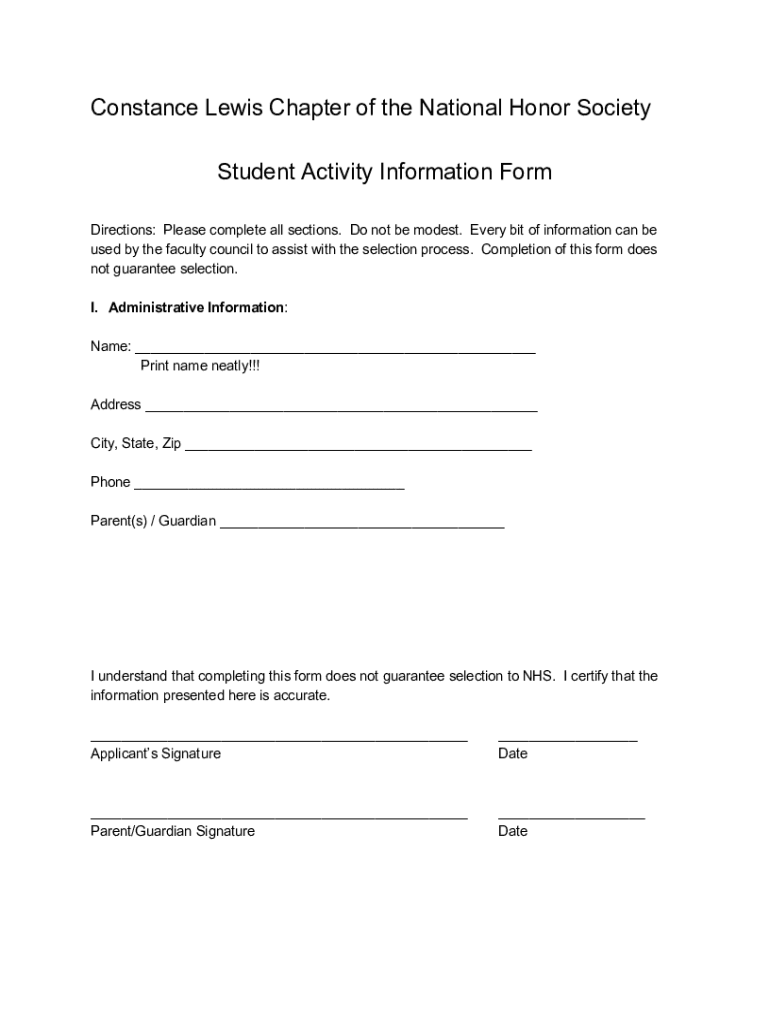 Constance Lewis Chapter of the National Honor Society Student Activity Information Form Directions: Please complete all sections. Do not be modest. Every bit of information can be used by the faculty