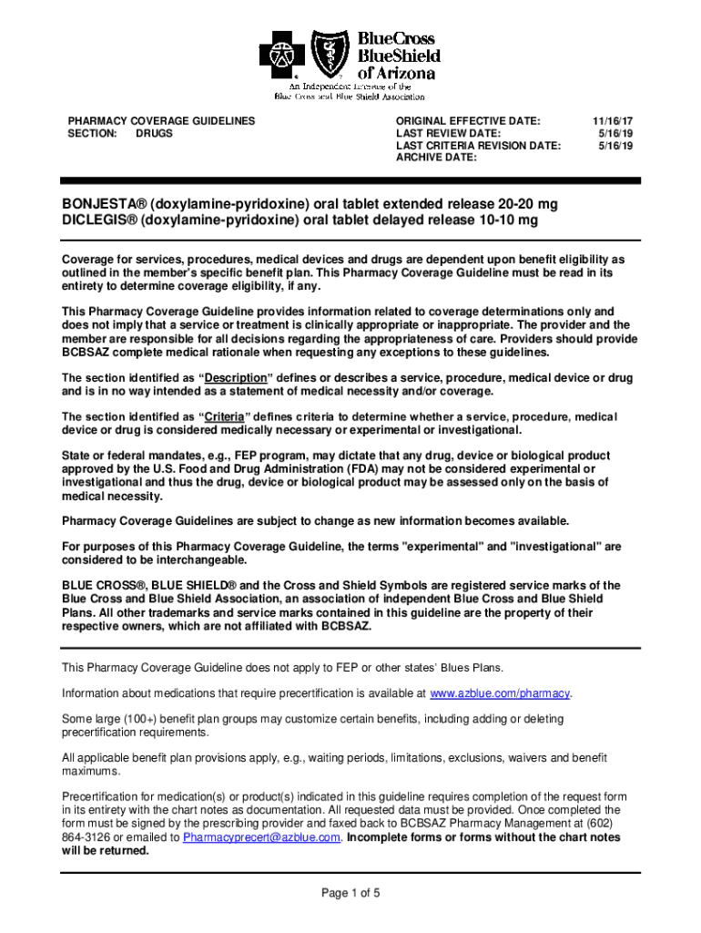PHARMACY COVERAGE GUIDELINES SECTION: DRUGSORIGINAL EFFECTIVE DATE: LAST REVIEW DATE: LAST CRITERIA REVISION DATE: ARCHIVE DATE:11/16/17 5/16/19 5/16/19BONJESTA (doxylaminepyridoxine) oral tablet