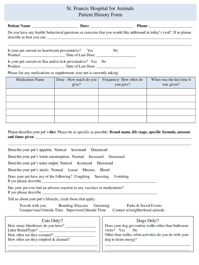 St. Francis Hospital for Animals Patient History Form Patient Name: Date: Phone : Do you have any health/ behavioral questions or concerns that you would like addressed at today's visit? If so please