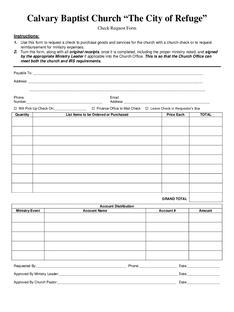 1. Use this form to request a check to purchase goods and services for the church with a church check or to request