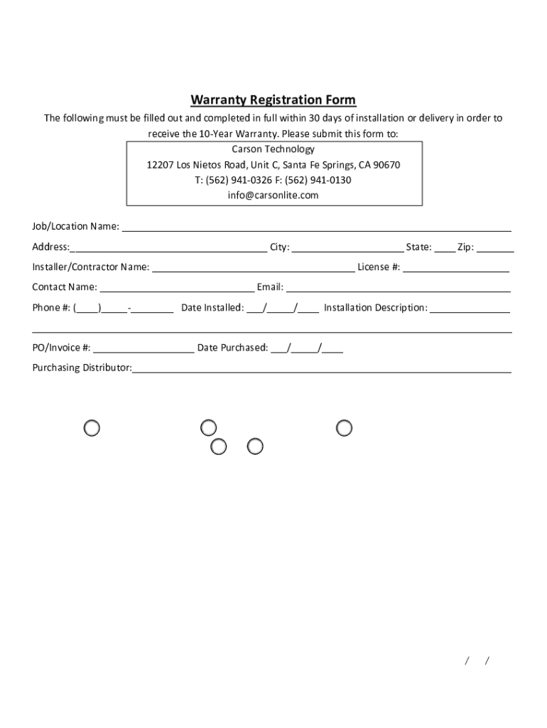For Office Use Only Date Received: WR#:Warranty Registration Form The following must be filled out and completed in full within 30 days of installation or delivery in order to receive the 10Year Warranty.