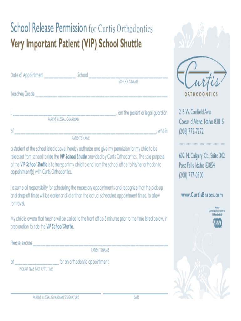 School Release Permission for Curtis OrthodonticsVery Important Patient (VIP) School Shuttle Date of Appointment School SCHOOLS NAMETeacher/Grade I, am the parent or legal guardian PARENT / LEGAL