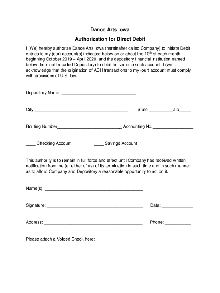 Dance Arts Iowa Authorization for Direct Debit I (We) hereby authorize Dance Arts Iowa (hereinafter called Company) to initiate Debit entries to my (our) account(s) indicated below on or about the