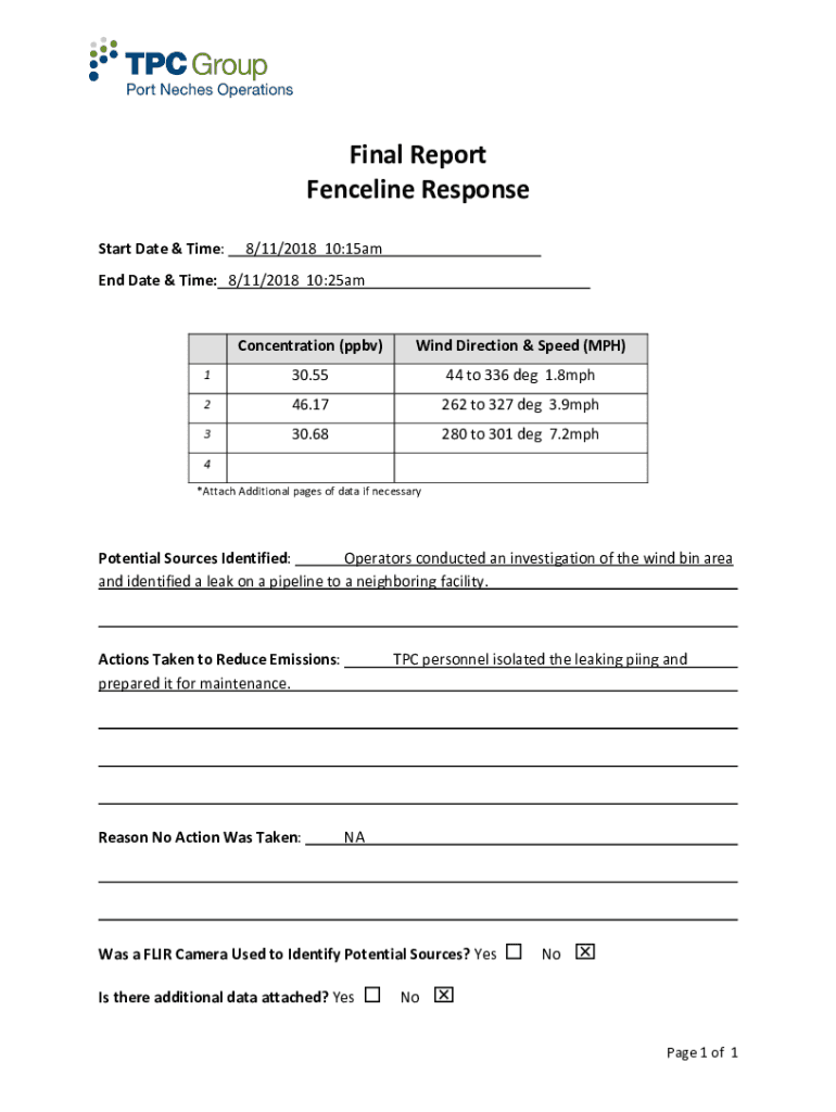Final Report Fence line Response Start Date & Time:8/11/2018 10:15amEnd Date & Time: 8/11/2018 10:25amConcentration (ppb)Wind Direction & Speed (MPH)130.5544 to 336 deg 1.8mph246.17262 to 327 deg