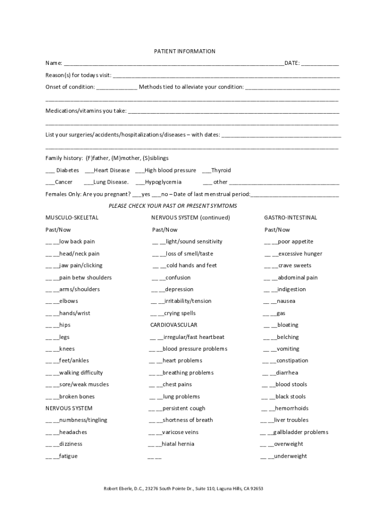 PATIENT INFORMATION Name: DATE: Reason(s) for today's visit: Onset of condition: Methods tied to alleviate your condition: Medications/vitamins you take: List your surgeries/accidents/hospitalizations/diseases